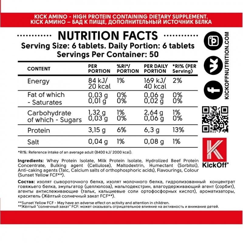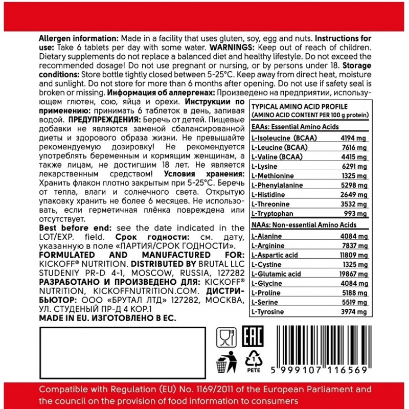 AMINO TABLETS от KickOff Nutrition - включает важнейшие аминокислоты, в том числе аминокислоты с разветвленными боковыми цепочками BCAA. Каждая порция содержит незаменимые аминокислоты ВСАА, которые будут способствовать восстановлению ваших мышц. ВСАА имеет решающее значение в предотвращении разрушения мышечной ткани.
