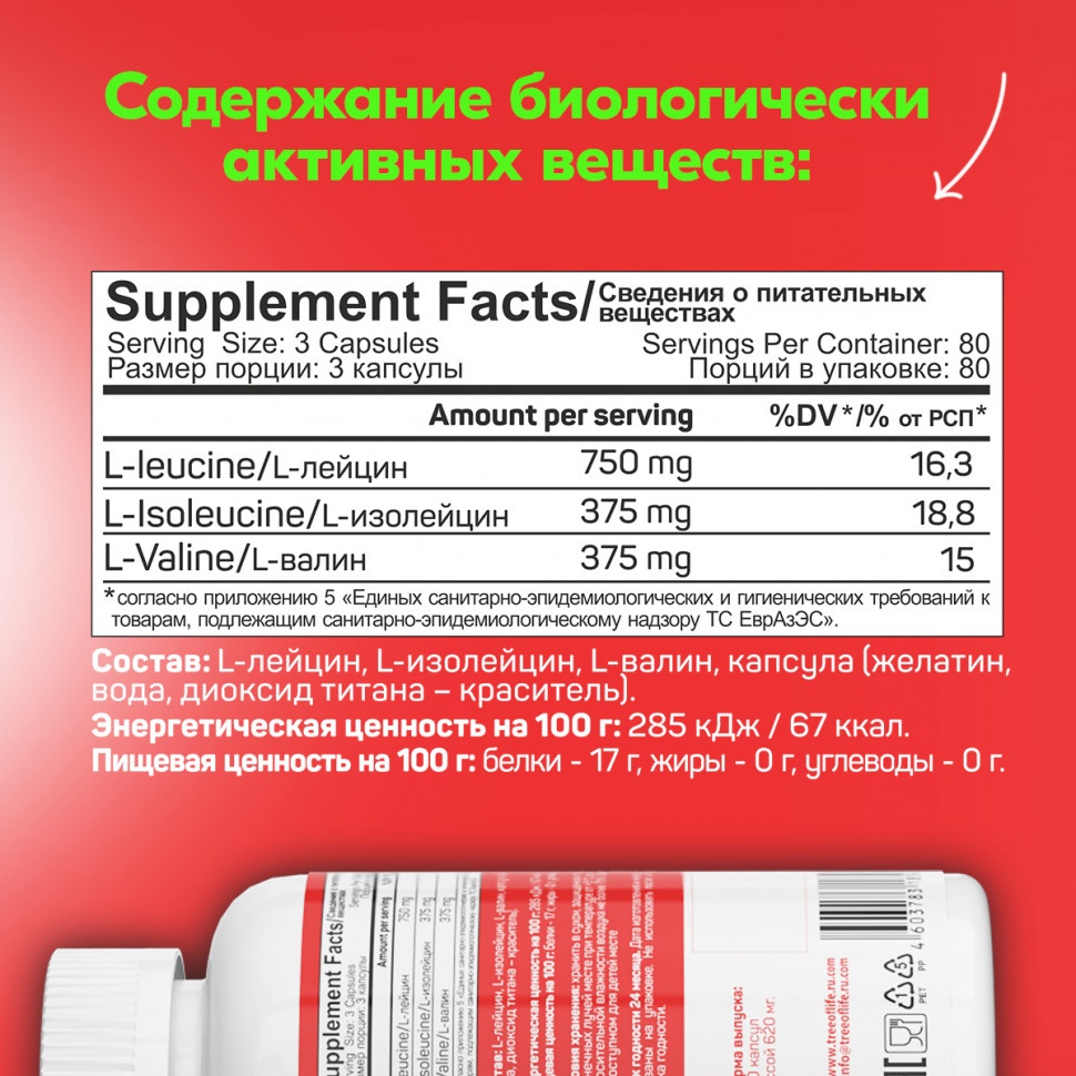 В комплексе сочетаются 3 незаменимые аминокислоты в стандартном и самом эффективном соотношении 2-1-1.