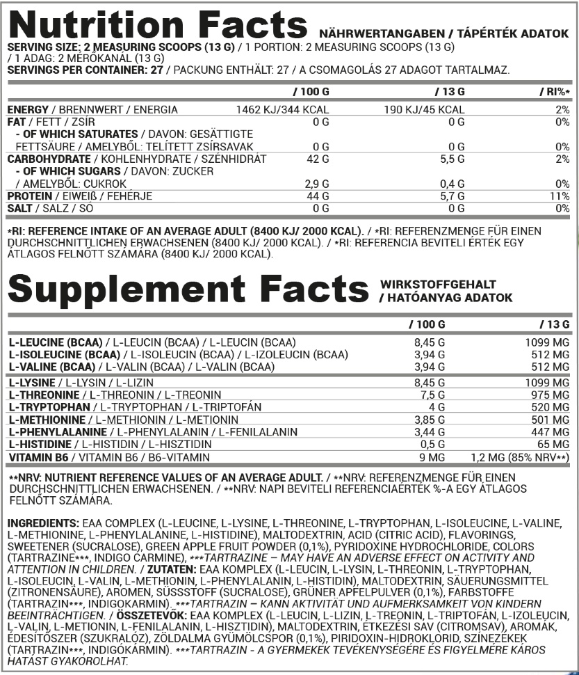 В случае активного или стрессового образа жизни наш организм обладает исключительно высокой потребностью в незаменимых аминокислотах, что особенно справедливо для аминокислот BCAA. Настоятельно рекомендуется дополнительное снабжение этими аминокислотами, и что может быть более удобным и освежающим способом, чем использование вкусного и полезного напитка с высоким содержанием EAA? Комплекс помогает получить нужное количество незаменимых аминокислот и станет идеальным дополнением к любым спортивным тренировкам.