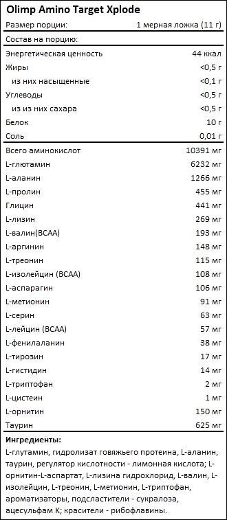 В составе Amino Target Xplode от Olimp содержатся аминокислоты из говяжьего гидролизата, а также аминокислоты в свободной форме. На 1 порцию приходится более 10 г аминокислот, в том числе глютамина и таурина. Аминокислоты необходимы нашему организму для надлежащего роста и развития. В условиях регулярных тренировок они включаются в белковый синтез и тем самым создают условия для роста мышц и для борьбы с катаболическими процессами. После физических нагрузок аминокислоты расходуются на поддержание восстановительных процессов.