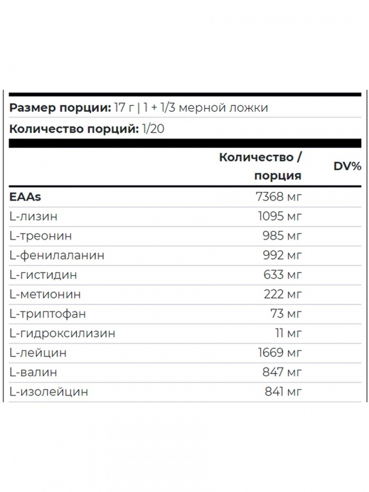 Применение: Смешайте 1 порцию (17 г или 1 + 1/3 мерной ложки) порошка All Aminos в день с 400 мл холодной воды. Принимайте одну порцию во время тренировки. В дни отдыха принимайте по одной порции между приемами пищи.