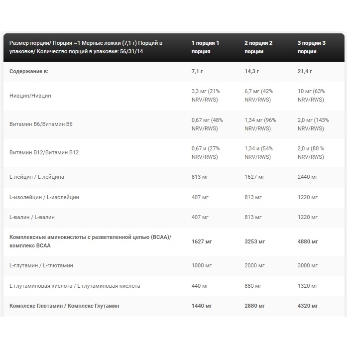 Она включает в себя незаменимые аминокислоты ЕАА и ВСАА, глютамин, цитруллин, L-карнитин и витамины группы В.