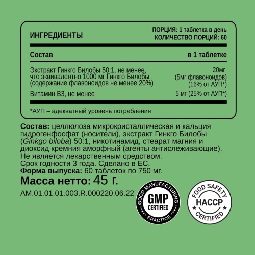 Экстракт листьев (120 мг на порцию) - содержит более 40 полезных элементов, а также собственные уникальные компоненты – билобалиды, гинкголиды, терпеновые лактоны, флавоноиды, гинкголиды и гетерозидоты и витамины группы А, В, С