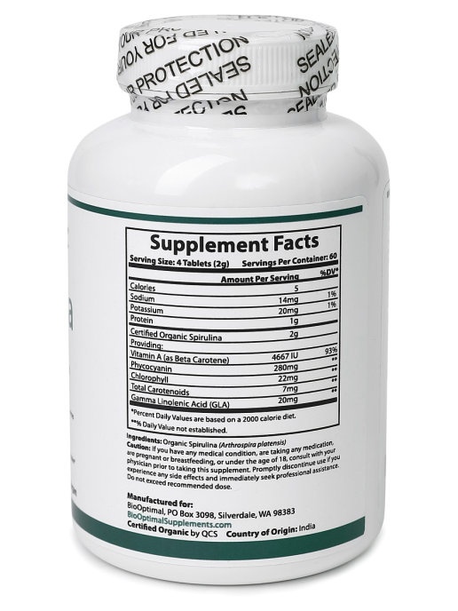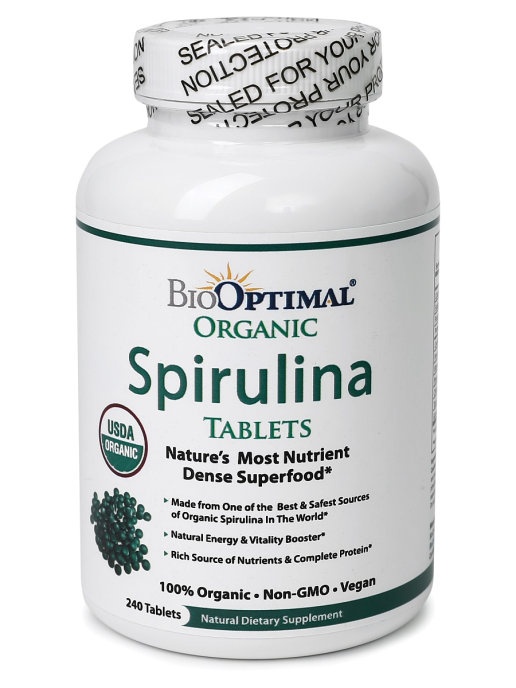 Пищевая добавка от американской компании БиоОптимал содержит сертифицированную органическую спирулину. Спирулина является водорослью сине-зеленого цвета, содержит основное действующее вещество - фикоцианобилин.