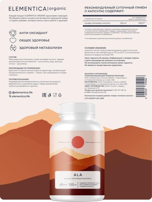 Интернет-магазин Body-Pit.Life предлагает купить Антиоксидант ELEMENTICA ALA 100 мг 60 капсул в Нерюнгри.