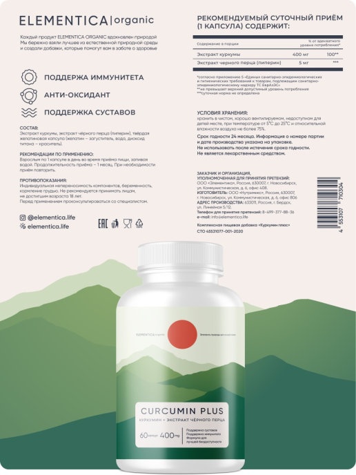 Антиоксидант ELEMENTICA Curcumin Plus 400 мг 60 капсул