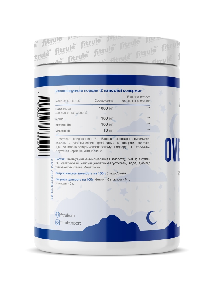 Fitrule OverNight – отличается от большинства ночных комплексов, которые в основном одержат только мелатонин. Сочетание мелатонина и ноотропов делает Fitrule OverNight незаменимым для спортсменов и людей ведущих активный образ жизни. GABA и 5-HTP обеспечивают быстрое и полное восстановление центральной нервной системы (ЦНС) после тренировки или тяжёлого рабочего дня, благодаря тому, что улучает проводимость нервных импульсов между нейронами. Это позволяет компенсировать те затраты ЦНС, которые были получены во время тренировки, тем самым быстро восстановить функциональность мышц и организма в целом. Восстановленная ЦНС – восстановленный организм!