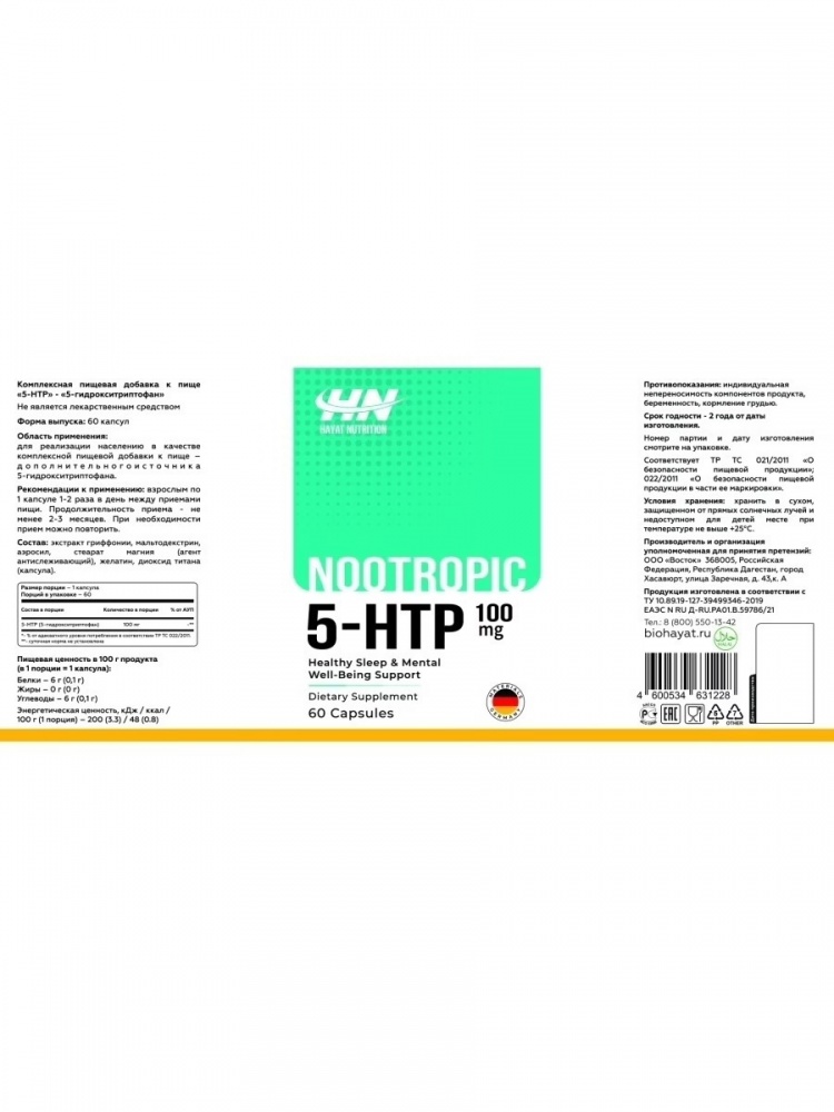 Интернет-магазин Body-Pit.Life предлагает купить Антиоксидант Hayat Nutrition 5-HTP 100 мг 60 капсул в Нерюнгри.