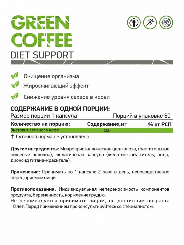 Green Cofee Extract - является концентрированным источником хлорогеновой кислоты и на данный момент используется в качестве добавки для сердечного здоровья и потере веса. Экстракт зеленого кофе содержит: кофеин оказывает общестимулирующее воздействие, бодрит, тонизирует, повышает умственную и физическую активность, эфирные масла благотворно влияют на состояние кожи, волос и ногтей, хлорогеновую кислоту - является источником дополнительной энергии, способствует ускоренному расщеплению подкожного жира, блокирует негативное воздействие токсинов в организме, эфирные масла благотворно влияют на состояние кожи, волос и ногтей. Препарат обладает следующими свойствами: значительно снижает уровень сахара в крови, насыщает организм мощными антиоксидантами, тормозит процессы старения, активизирует метаболизм, способствует ускоренному сжиганию жировых отложений, избавляет от целлюлита, снижает аппетит, нормализует уровень холестерина.