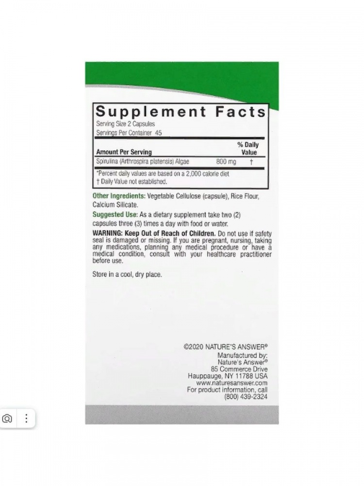 Антиоксидант Nature’s Answer Spirulina 90 капсул