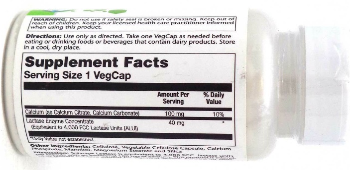 Solaray Lactase эквивалентна 4000 единиц лактазы FCC на капсулу с дополнительными 100 мг кальция. Этот продукт предназначен для обеспечения питательной поддержки для переваривания лактозы. Подходит для вегетарианцев.