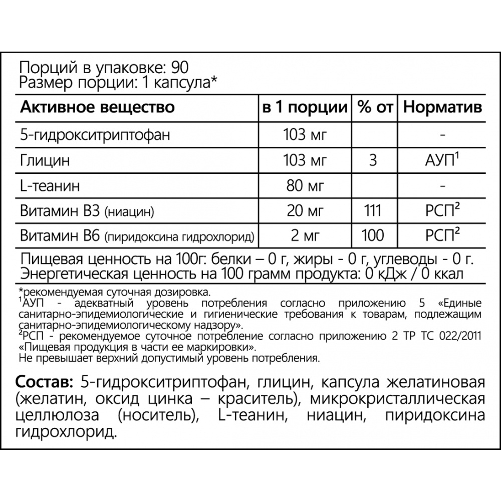 5-HTP способствует выработке серотонина, регулирующего настроение и сон. Глицин и L-теанин усиливают его эффект, оказывая успокаивающее действие и улучшая когнитивные функции. Витамины группы B поддерживают нервную систему и энергетический обмен, помогая организму быстрее восстанавливаться после тренировок.