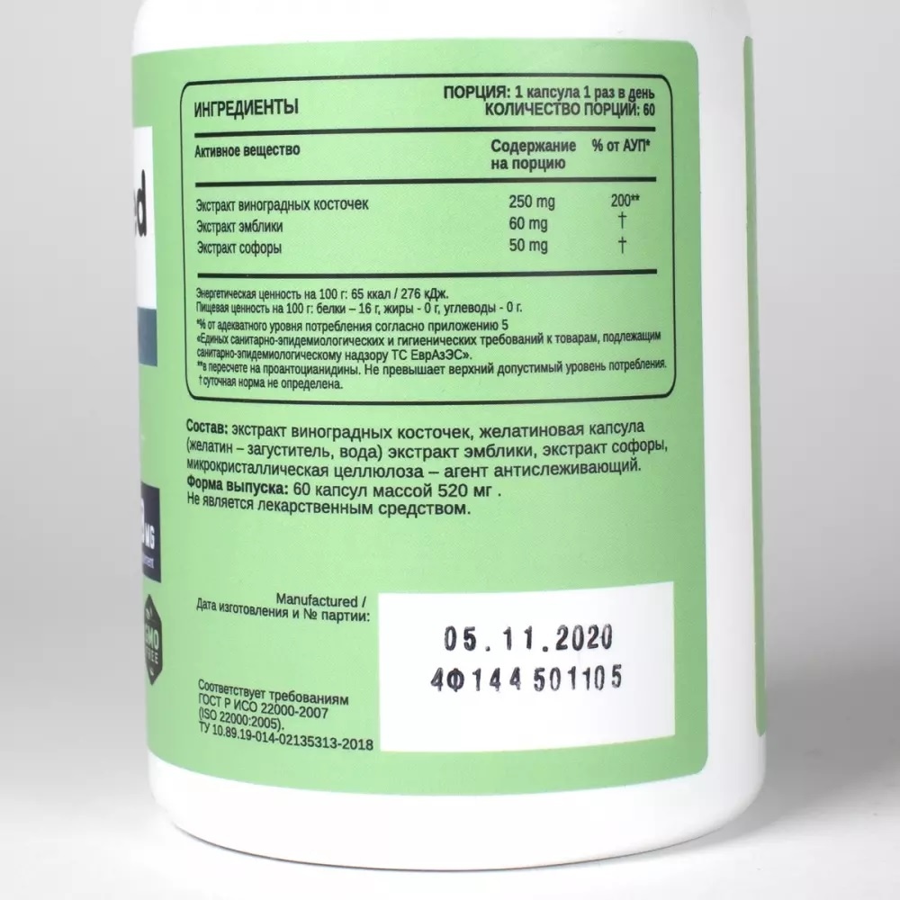 Состав: экстракт виноградных косточек, желатиновая капсула (желатин – загуститель, вода) экстракт эмблики, экстракт софоры, микрокристаллическая целлюлоза – агент антислеживающий.