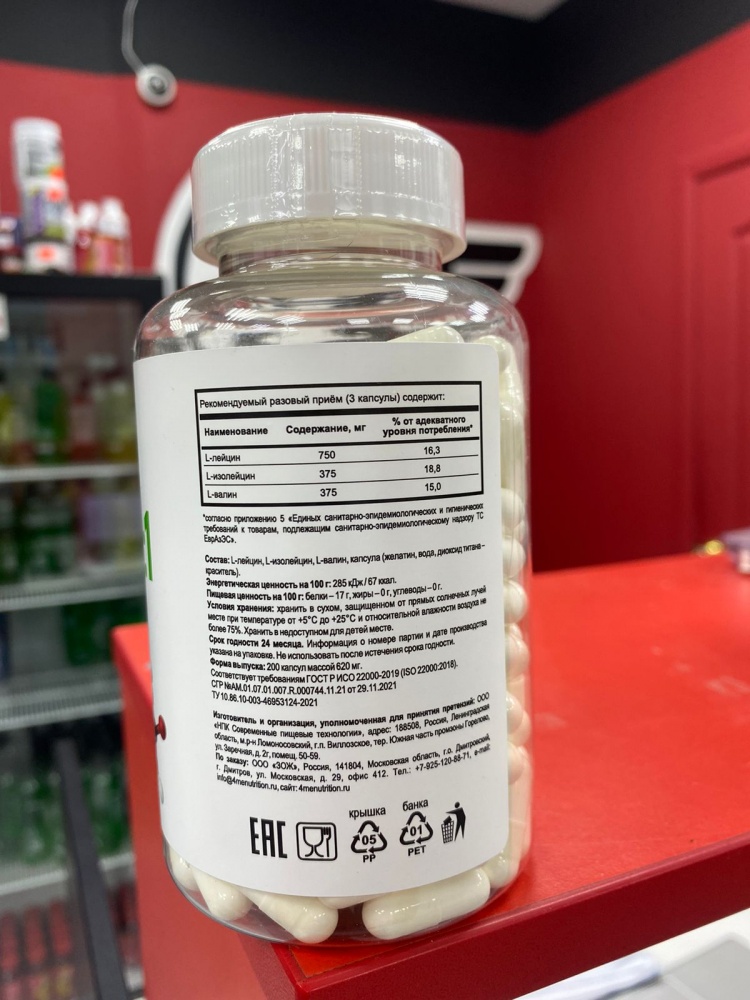 Ингредиенты: L-лейцин, L-валин, L-изолейцин, желатин.