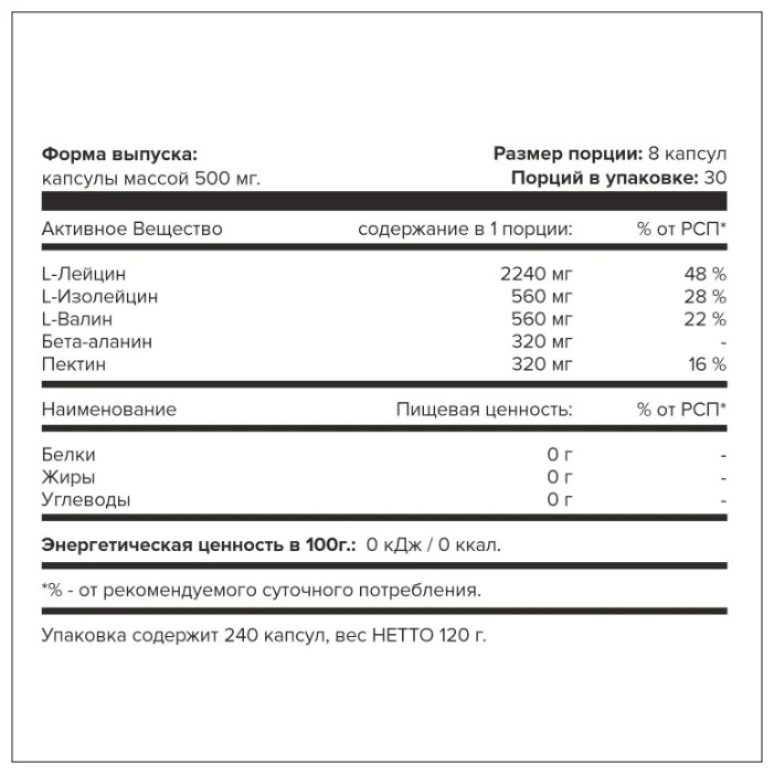Аминокислотный комплекс ВСАА 4-1-1 - полностью натуральная добавка незаменимых аминокислот. Входящий в его состав ВСАА в пропорции 4-1-1 эффективно устраняет мышечный катаболизм, активизирует набор мышечной массы, восстанавливает энерго-обмен, ускоряет синтез белка, уменьшает болевые симптомы после интенсивных тренировок.В комплексе с ежедневной физической активностью поможет быстрей похудеть и улучшить состояние кожи, волос, ногтей, а также усилить упругость мышц, делая тело более рельефным - за счет снижения чувства голода и быстрого восполнения аминокислотного состава в организме.