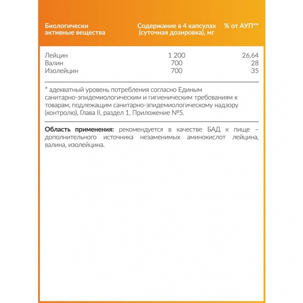 Состав: Лейцин, валин, изолейцин, капсула (желатин).