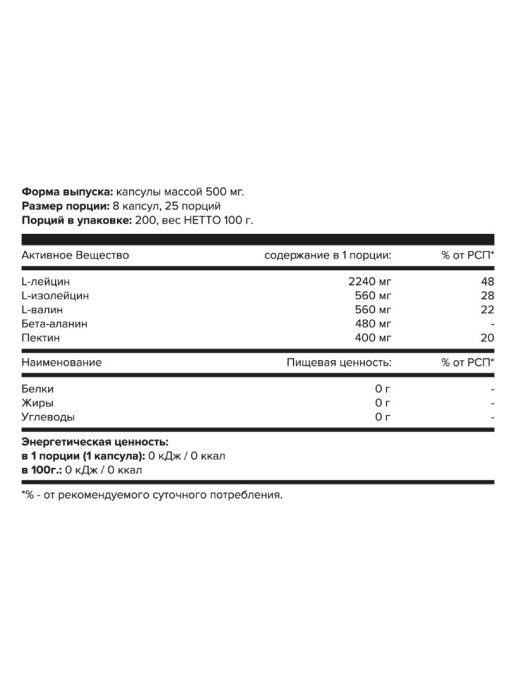 Аминокислотный комплекс ВСАА 4-1-1 - это специализированный пищевой продукт для питания спортсменов. Входящий в его состав ВСАА в пропорции 4-1-1 эффективно устраняет мышечный катаболизм, активизирует набор мышечной массы, восстанавливает энерго-обмен, ускоряет синтез белка, уменьшает болевые симптомы после интенсивных тренировок.