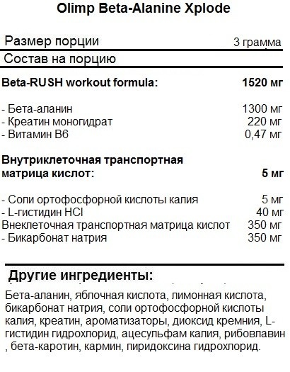 Гистидин включен в состав данной добавки также неспроста, поскольку именно он в паре с бета-аланином участвует в синтезе карнозина. Тем более что производство гистидина для организма также не является простой задачей. Чтобы помочь ему в этом, и существует Beta-Alanine Xplode от Olimp.