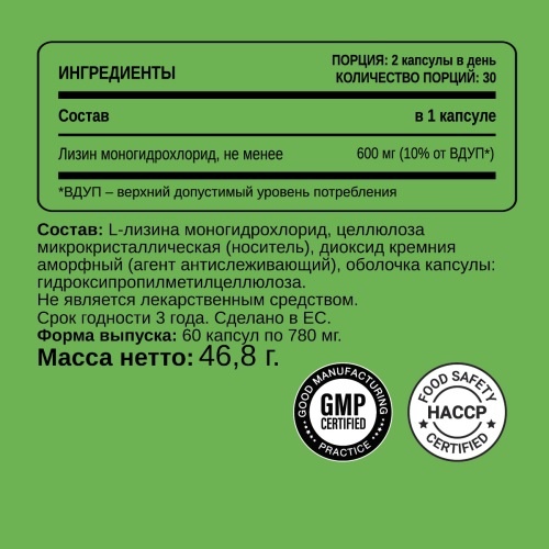 Правила применения: Л-лизин принимают перед едой, по 23 мг на 1 кг веса в день. Если добавка используется в лечебных целях, дозировка может повышаться.