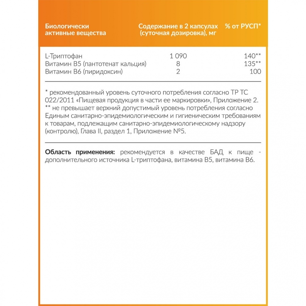 Состав: L-триптофан, витамин В5 (пантотенат кальция), витамин В6 (пиридоксин), капсула (желатин).
