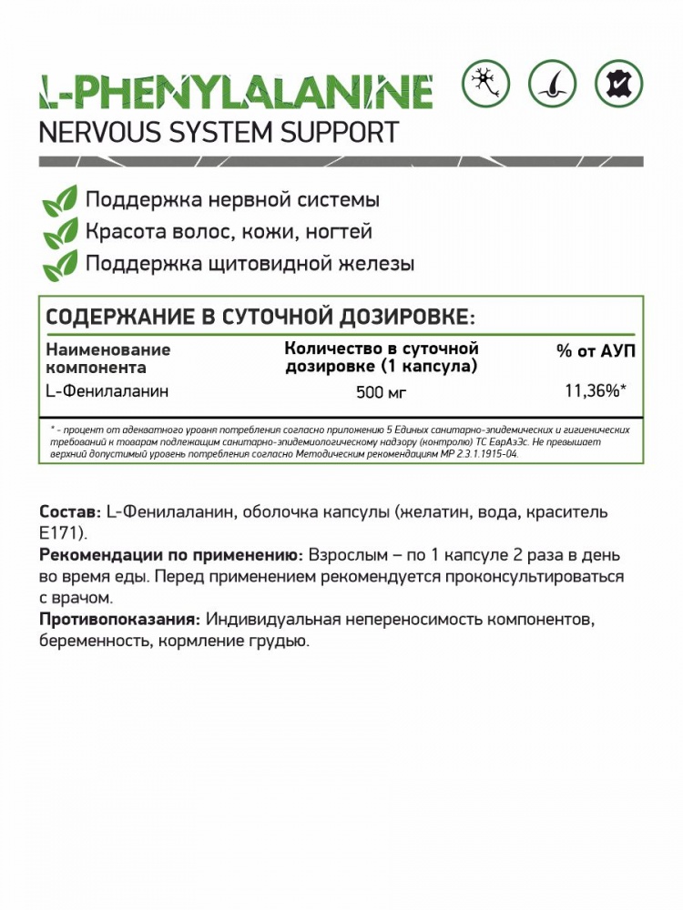 L-Фенилаланин регулирует работу нервной системы, позволяет успешно справляться с раздражением и чувством тревоги, улучшает настроение, облегчает психологический дискомфорт. Также, положительно действует на биохимические процессы мозга, протекающие в случае повышенной нагрузки, повышает способности человека к восприятию различной информации.