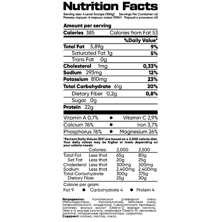 Это дополнительный источник энергии в виде комбинированных углеводов с разным гликемическим индексом и легко усваиваемый белок для более быстрого набора мышечной массы.