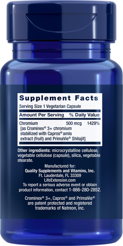 Хром [в виде Хроминекса 3+ хром, стабилизированный экстрактом амлы Capros (фрукты) и молоком PrimaVie]: 500 мкг