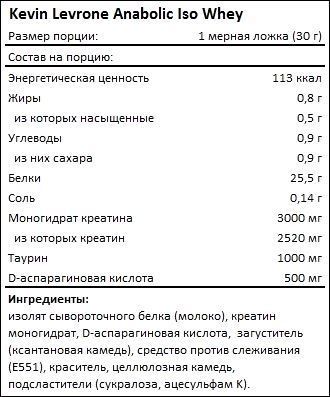 В основе Anabolic Iso Whey от Kevin Levrone содержится сывороточный изолят. На 1 порцию приходится 25,5 г данного белка. В чем особенность сывороточного изолята? В нем есть все незаменимые аминокислоты, которые необходимы мышцам для роста, восстановления и борьбы с катаболическими процессами. Способ получения сывороточного изолята предполагает удаление из него почти всех жиров и сахаров, поэтому такой протеин можно использовать во время сушки и диеты.