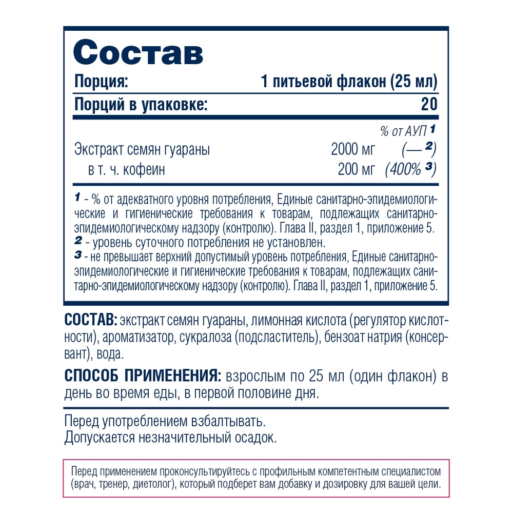 Жидкая гуарана полностью подготовлена к употреблению – добавка не требует дополнительных манипуляций, вроде размешивания в воде или запивания. Достаточно открутить крышку, выпить содержимое и выкинуть опустевшую ампулу. Данный экстракт гуараны является самым удобным для использования и быстро действующим из всех. Он обеспечивает максимальный заряд бодрости и энергии: немного больше, чем порция двойного эспрессо (125 мг кофеина), но немного меньше, чем большая кружка крепкого кофе (300 мг кофеина), или примерно столько, сколько в 3-х чашках хорошего крепкого зеленого чая. В одной питьевой ампуле Guarana Liquid 2000 содержится 200 мг кофеина. Это дает полноценный основательный тонизирующий эффект – бодрость нарастает незаметно, продолжается около 2-3 часов и так же незаметно исчезает, в отличие от обычного для чистого кофеина резкого спада.