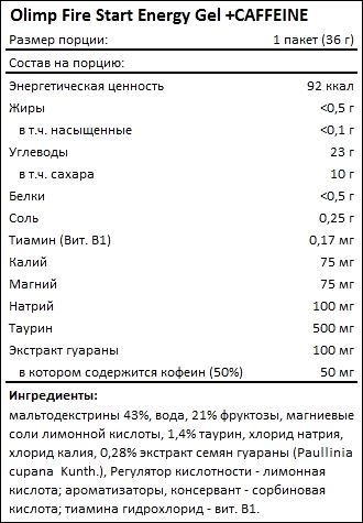 Формула энергетического геля Fire Start Energy Gel plus BCAA включает углеводы мальтодекстрин и фруктозу, а также BCAA, или аминокислоты с разветвленными боковыми цепочками. В составе комплекса присутствуют также магний, натрий и калий. В Fire Start Energy Gel plus Caffeine дополнительно содержится кофеин для ментальной энергии и фокусировки.