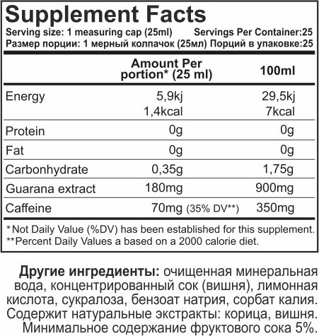 Используя как пищевую добавку, принимайте 1 порцию (25 мл.) за 20-30 минут до тренировки, используя мерный колпачок на бутылке. Вы можете также смешать одну порцию (25мл.) с 100 мл. воды. Принимать не более двух порций в день.