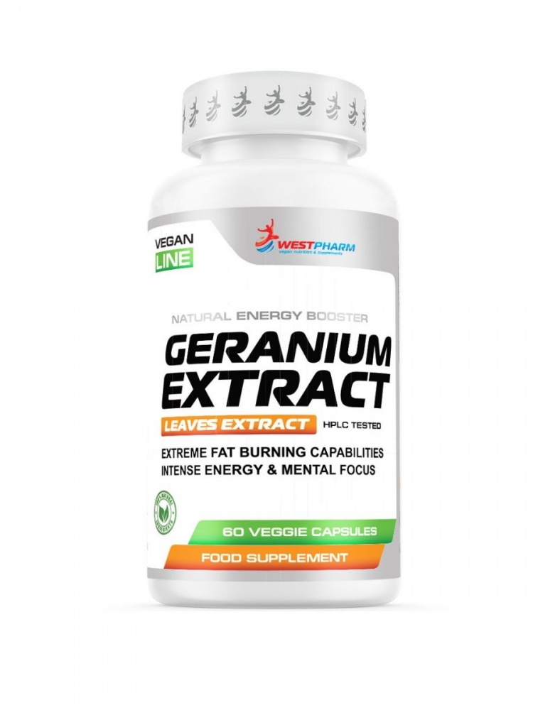 Geranium Extract Vegan line — натуральный экстракт гер-ни, не содержащий синтетическую гер-нь. Прием добавки повышает выносливость, а также когнитивные возможности мозга. Именно экстракт, а не синтетический аналог, помогает организму использовать жир как топливо для мышц и работы мозга, за счет чего и происходит снижение процента жира. Попутно из организма выводится лишняя жидкость и уменьшается вес.