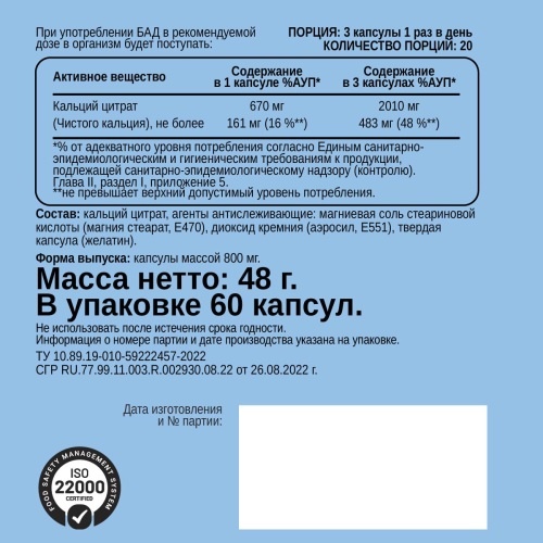В БАД CHIKALAB CALCIUM BIOCAPS используется форма цитрата кальция. Цитрат кальция - соль, которая согласно исследованиям ученых является лучшим источником кальция по степени усвоения и отсутствию побочных реакций. Усвоение кальция из этой соли не зависит от приема пищи и кислотности желудочного сока, что особенно актуально для людей старше пятидесяти лет имеющих сниженную кислотность. Цитрат кальция способствует уменьшению образования количества оксалатов в моче, уменьшает риск образования песка и камней в почках. Продукт распада цитрата кальция продолжает работать в организме, включаясь в энергетический цикл клеток.