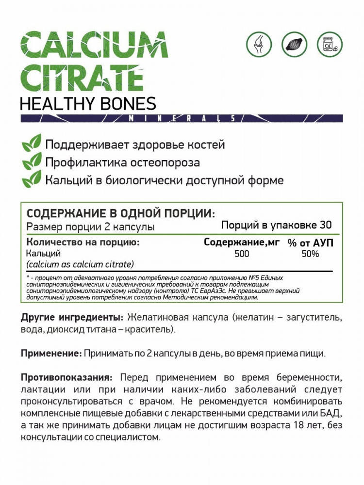 Кальция цитрат -это легко усваиваемая форма кальция, который необходим для поддержания здоровья костей. Кальций принимает непосредственное участие в самых сложных процессах, среди которых свертывание крови, поддержка равновесия между возбуждением и торможением коры головного мозга, расщепление гликогена, обеспечение проницаемости сосудистых стенок. Минерал необходим для передачи нервных импульсов - он активизирует действие ферментов, которые участвуют в выработке нейромедиаторов. Поскольку кальций поддерживает возбудимость нервных тканей и сокращаемость мышц, при его недостатке возникают мышечные спазмы и судороги, а также покалывания в стопах и запястьях. Кальций влияет на проницаемость мембран. Он необходим для транспортировки питательных веществ и других соединений через клеточные мембраны.
