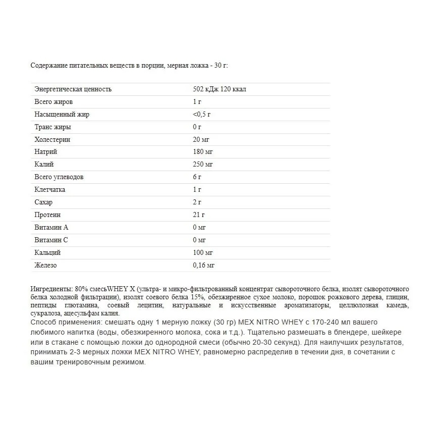 Каждая порция MEX NITRO WHEY содержит 21 грамм аминокислот с высокой биодоступностью и всего 1 грамм жира, что делает его идеальным для восстанавливающих коктейлей после тренировки и для сочетания с высокоуглеводными блюдами и добавками.
