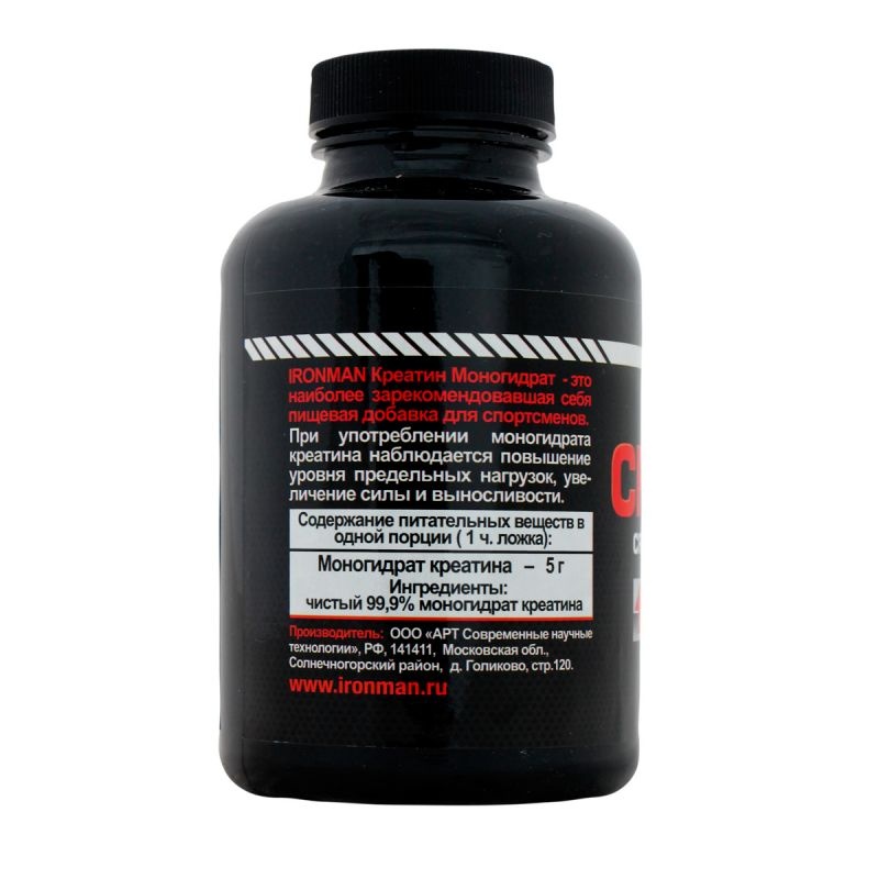 Креатин Моногидрат - это одна из самых популярных пищевых добавок для спортсменов. Исследования показали, что при употреблении моногидрата креатина наблюдается повышение уровня предельных нагрузок, увеличение силы и выносливости. Это объясняется способностью моногидрата креатина поддерживать высокий уровень АТФ в клетках, при одновременном снижении концентрации аммиака в крови. В продуктах серии IRONMAN используется особо чистый моногидрат креатина марки CreaPure, полностью свободный от вредных примесей креатинина, дициандиамида и др.