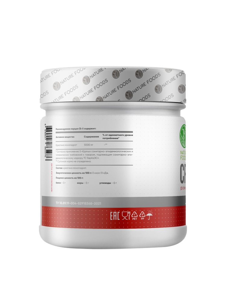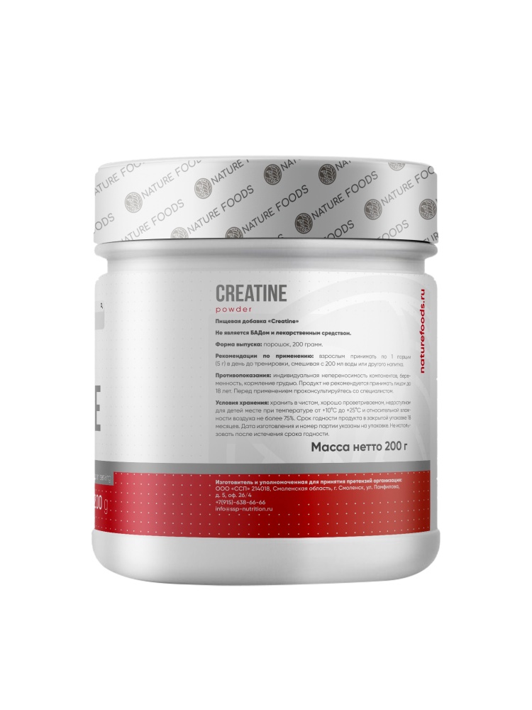 Nature Foods Creatine 200 гр – важнейший энергетический субстрат для мышц при выполнении высокоинтенсивной нагрузки! При выполнении предельной или около предельной нагрузки, траты АТФ в мышцах достигают пикового расхода. Чтоб организм снабдить невероятно огромным количеством энергии в единицу времени, необходимо нечто очень высокоэнергетическое и с высоким КПД. Таким компонентом в наших мышцах может выступить только креатин, поэтому так важно поддерживать его высокий уровень концентрации постоянно! Только так организм выдержит регулярный высокоинтенсивный уровень нагрузки.