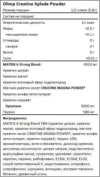 Все включенные в состав Creatine Xplode формы креатина характеризуются великолепной анаболической и энергетической активностью. Создателям удалось объединить в одном продукте 6 наиболее популярных и эффективных соединений креатина, находящихся в оптимальном соотношении друг к другу. Таким образом, высвобождение молекул свободного креатина происходит незамедлительно после приема, благодаря чему организм сразу восполняет потребность в данном веществе в условиях резкой подверженности катаболизму, а именно после пробуждения и сразу после тренировки.