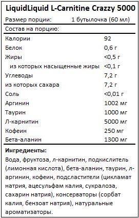 Комплекс L-Carnitine Crazzy 5000 от LiquidLiquid производится на основе карнитина в Германии из высококачественного сырья в соответствии с сертификатами качества ISO и IFS. Карнитин – это натуральное и полностью безопасное для нашего организма соединение, которое образуется в нашем теле. При определенных обстоятельствах (стрессы, физические нагрузки, возраст и т.п.) его запасы истощаются, поэтому целесообразно их восстанавливать. Делать это можно как раз за счет L-Carnitine Crazzy 5000. Помимо карнитина в нем есть аргинин, кофеин, таурин и бета-аланин.