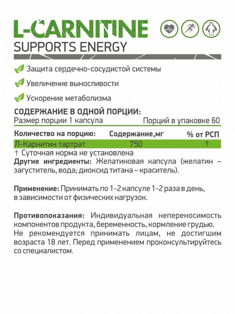 Л-Карнитин NaturalSupp L-Carnitine tartrat 60 капсул