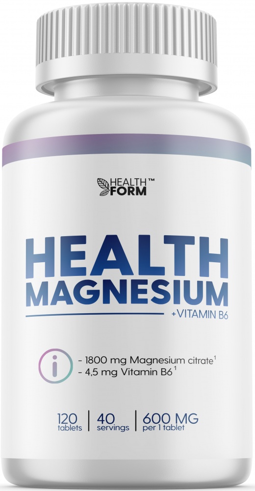 HEALTH MAGNESIUM + Vitamin B6 от HEALTH FORM - это источник минерала магния в форме цитрата с витамином B6 (пиридоксином гидрохлоридом) в таблетках.