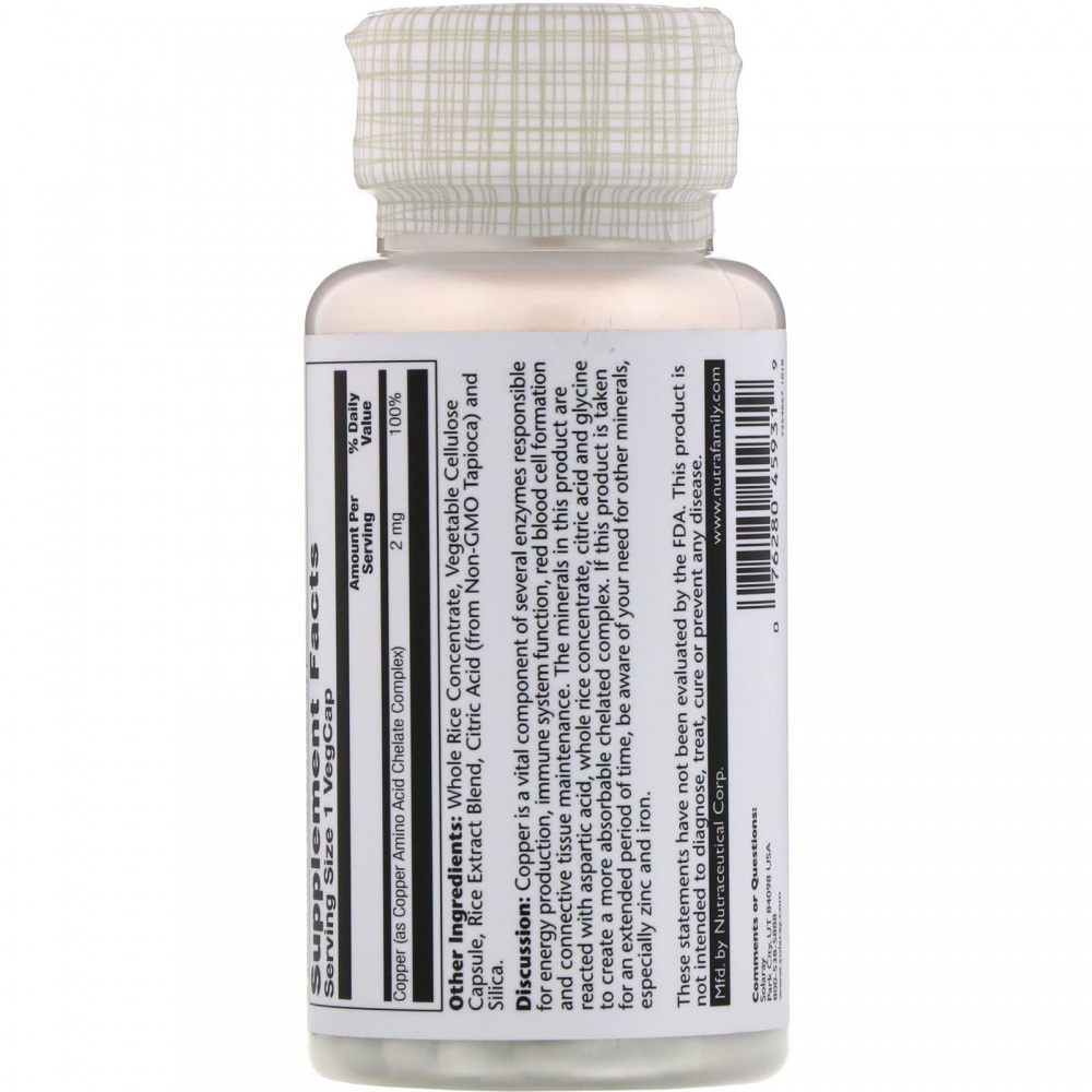 Медь — важный элемент нескольких ферментов, которые отвечают за выработку энергии, работу иммунной системы, формирование красных кровяных телец и поддержание соединительной ткани. В этом продукте минералы вступают в реакцию с аспарагиновой кислотой, концентратом из цельного риса, лимонной кислотой и глицином. В результате образуется хелатный комплекс с более высокой усвояемостью. При длительном приеме данного продукта необходимо помнить о потребности в других минералах, особенно в цинке и железе.