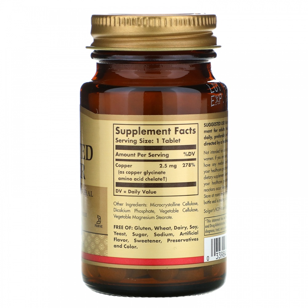 Медь — незаменимый микроэлемент. Она необходима для образования коллагена, поддерживающего соединительные ткани (такие как кожа, кости, хрящи и сухожилия). Данный препарат содержит запатентованную хелатную формулу меди с высокой биодоступностью.