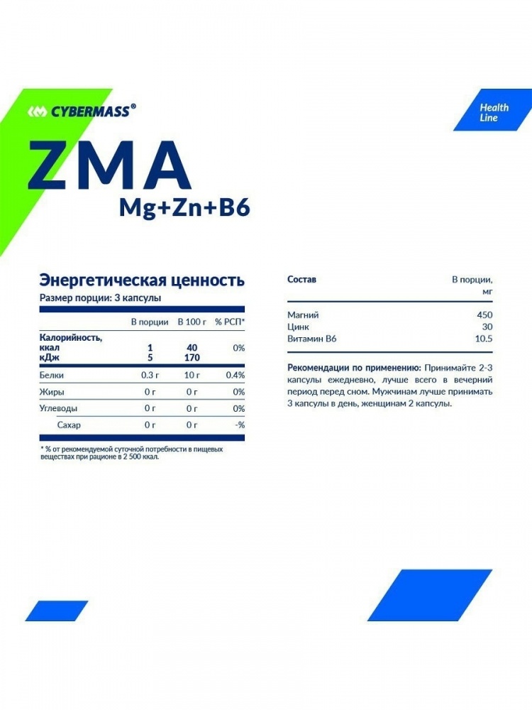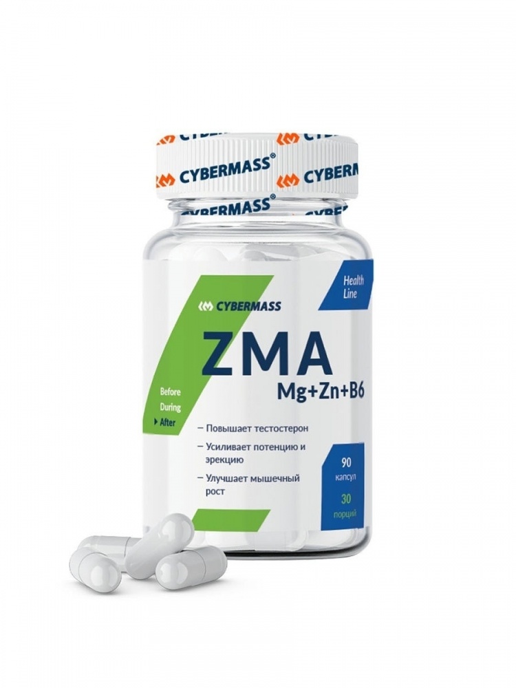 Cybermass ZMA Mg+Zn+B6 — капсулы, содержащие магний, цинк и витамин В6. Данная добавка особенно важна для бодибилдеров, так как она значительно повышает уровень тестостерона и препятствует его преобразованию в эстроген, увеличивает работоспособность, силу и выносливость спортсмена.