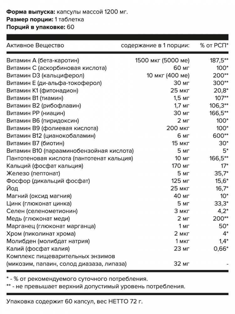 Достаточное поступление витаминов и минералов в организм жизненно необходимо для правильного функционирования органов и поддержки энергетического уровня человека. Комплекс будет полезен для здоровья глаз, костей, сердца и сосудов, обмена веществ, иммунной защиты, красоты кожи и волос, повышения уровня антиоксиданта для сохранения молодости организма. Кроме того, содержание смеси высокоэффективных пищеварительных ферментов помогают поддерживать здоровое пищеварение и ускоряют обмен веществ.