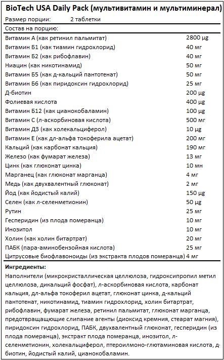 Daily Pack от BioTechUSA имеет идеально сбалансированный состав витаминов и минералов, оптимальную суточную дозу необходимых организму полезных элементов. Благодаря тщательно подобранной витаминно-минеральной формуле и удобной форме фасовки, Вам не нужно будет самостоятельно подсчитывать необходимую норму отдельных компонентов, все уже сделано для Вас профессионалами.