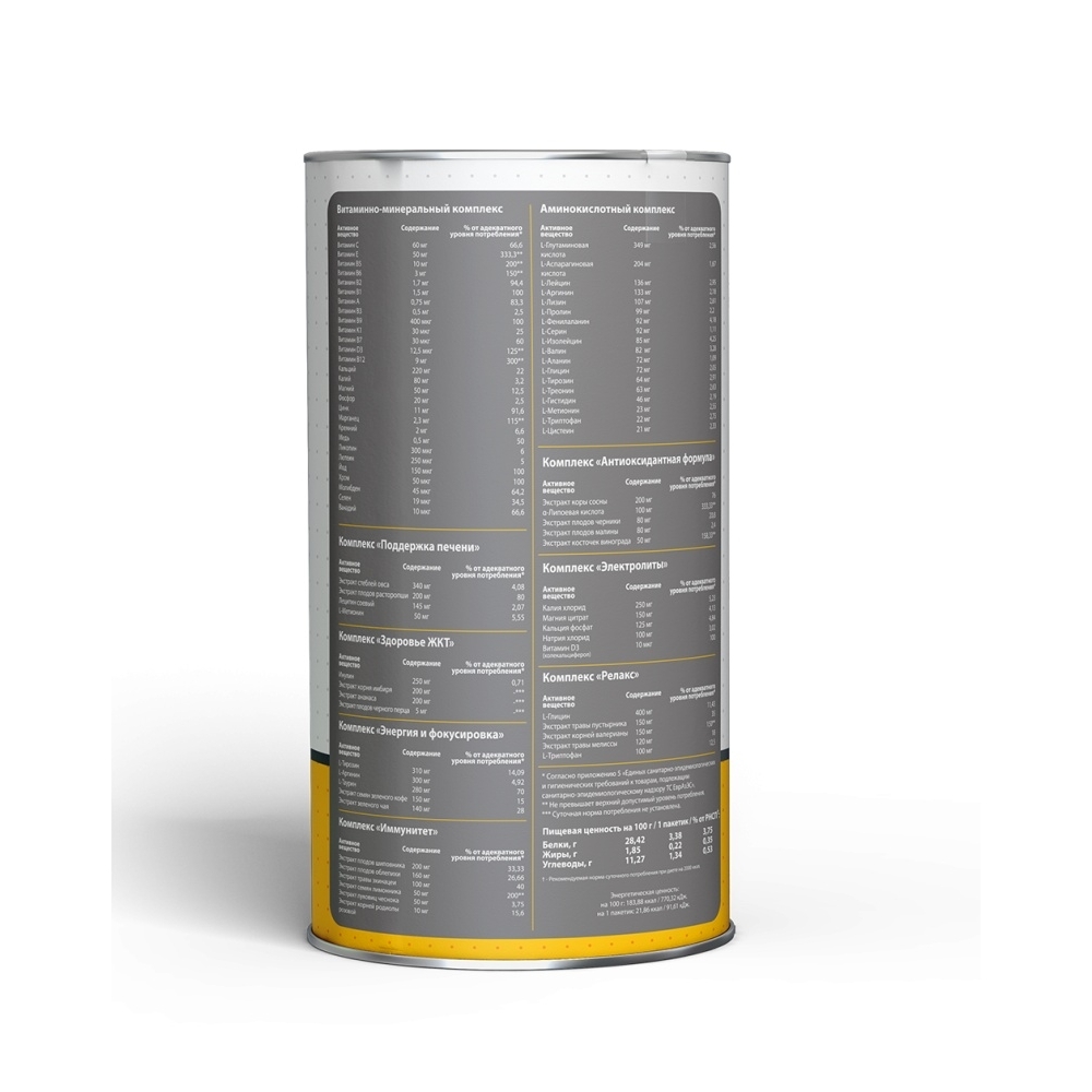 Комплекс «Энергия и фокус» (таблетка красного цвета): L-тирозин, L-аргинин, L-таурин, экстракт семян зеленого кофе, экстракт зеленого чая, наполнители - микрокристаллическая целлюлоза, крахмал; разрыхлитель – тальк; антислеживающие агенты - стеариновая кислота, диоксид кремния.