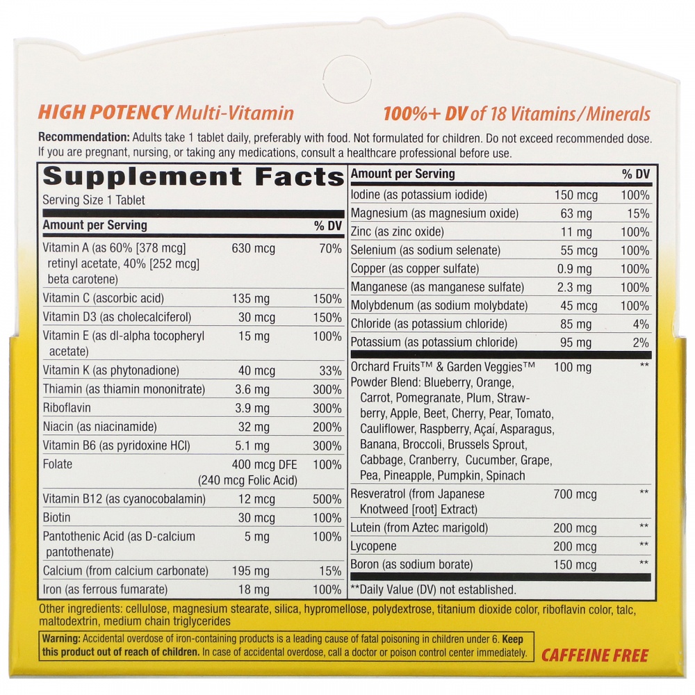 | Orchard Fruits и Garden Veggies (голубика, апельсин, морковь, гранат, слива, клубника, яблоко, свекла, вишня, груша, помидор, цветная капуста, малина, асаи, спаржа, банан, брокколи, брюссельская капуста, капуста, клюква, огурец, виноград, горох, ананас, тыква, шпинат): | 100 мг |