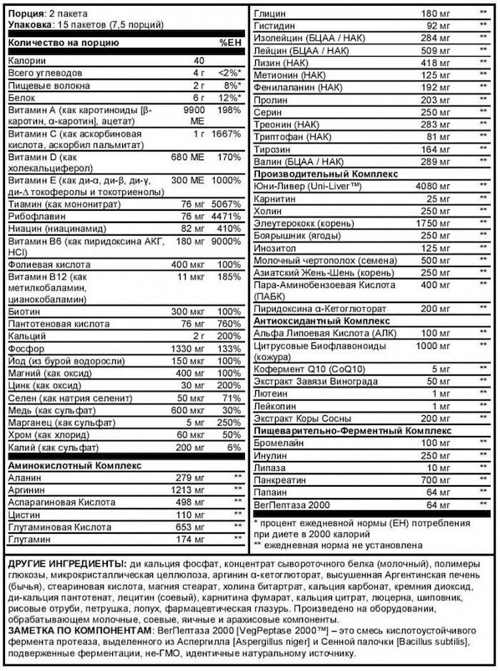 Препарат обеспечит вас превосходной комбинацией белков, мегавитаминов, лиофилизованными аминокислотами и необходимыми для тренировок факторами, такими как инозин, пиридоксин альфа-кетоглутарат (ПАК), протоген А и дибенкозид. Кроме того, каждый пакетик содержит энергетический комплекс мегациклических минеральных комплексов, липотропиков, пищеварительных ферментов и высокоэффективных активизаторов. Все эти элементы обладают взаимно усиливающим действием в сбалансированном, долгодействующем препарате из 11 таблеток, который легко усваивается Вашим организмом. А это означает уверенный рост мышц при тренировках.