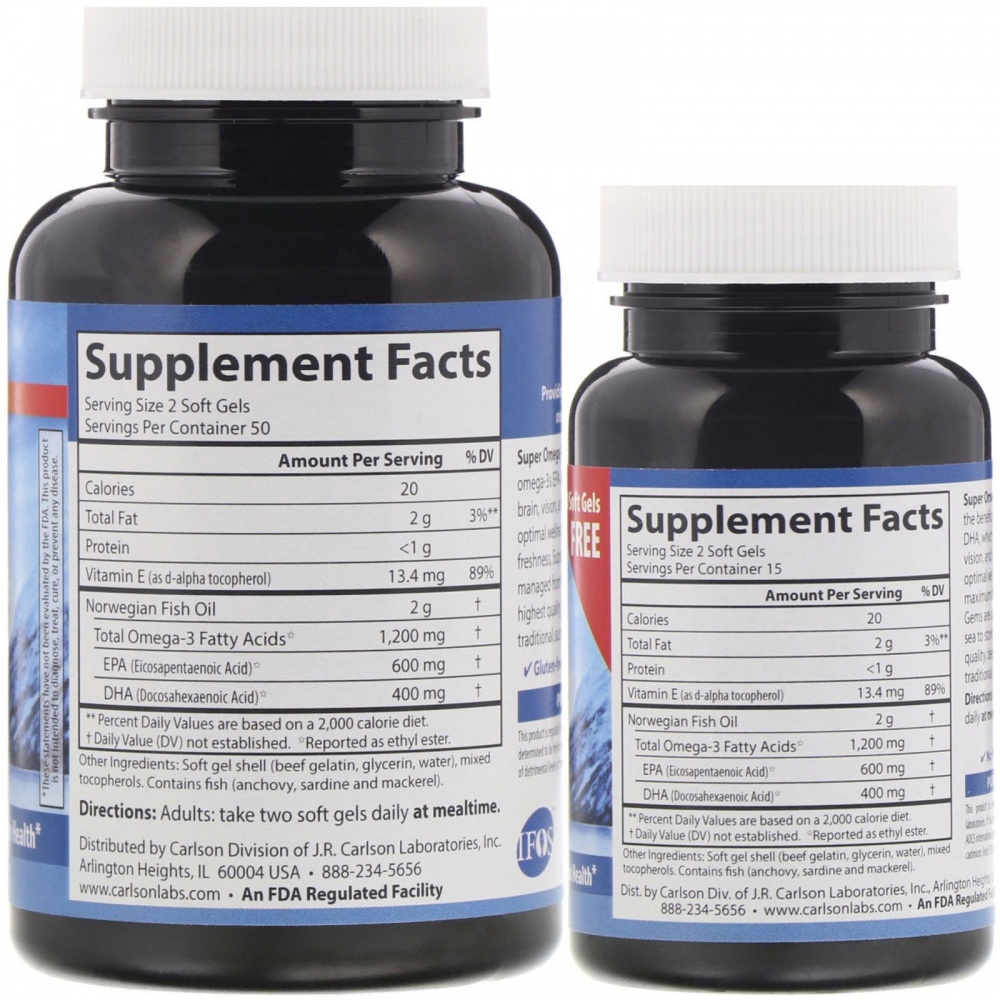 Super Omega-3 Gems, 1200 mg от Carlson Labs — это качественная добавка, насыщающая организм DHA и EPA в достаточной мере. Продукт изготовлен на основе норвежского рыбьего жира, что способствует покрытию суточной потребности Omega кислот.